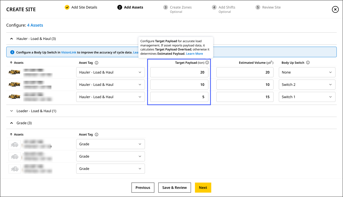 • You can set payload target for Hauler – Load & Haul and Scraper asset tags while only hauler assets will show overloading.