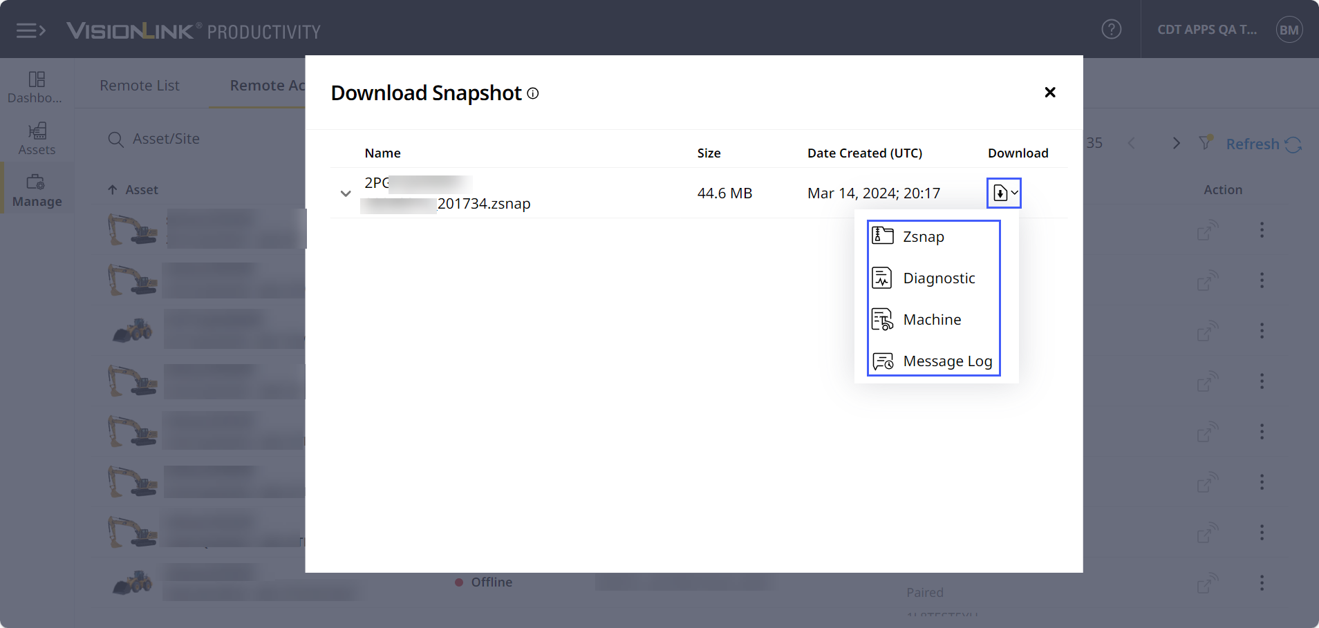 For grade asset setup and configuration, you can now download snapshot (.zsnap) files. Access the following files on Manage > Asset Services > Remote Access: