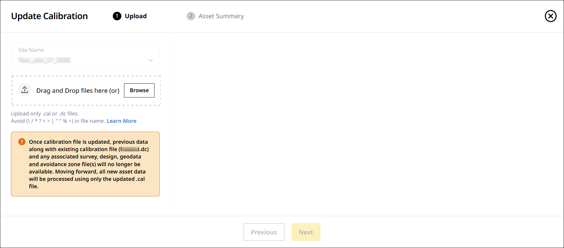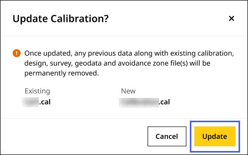 Caution: Once the calibration file is updated, previous data will no longer be available. This includes the previous calibration file and any associated survey, design, geodata and avoidance zone file(s) . Moving forward, all new asset data will be processed using only the updated .cal file.