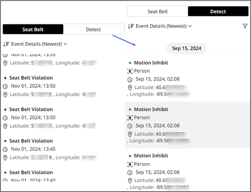 : View all safety events triggered by the asset for the selected date range across two tabs: Seat Belt and Detect.