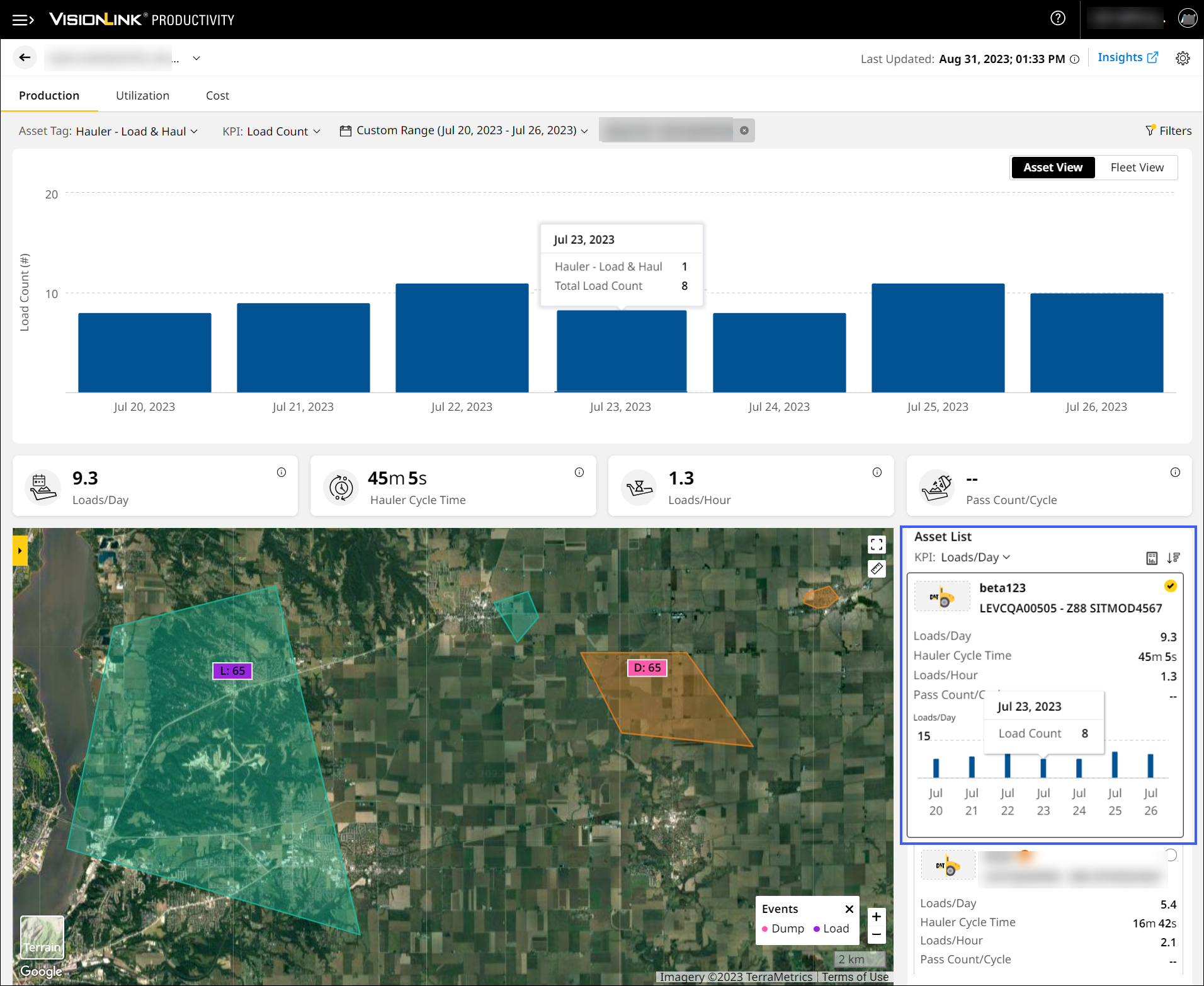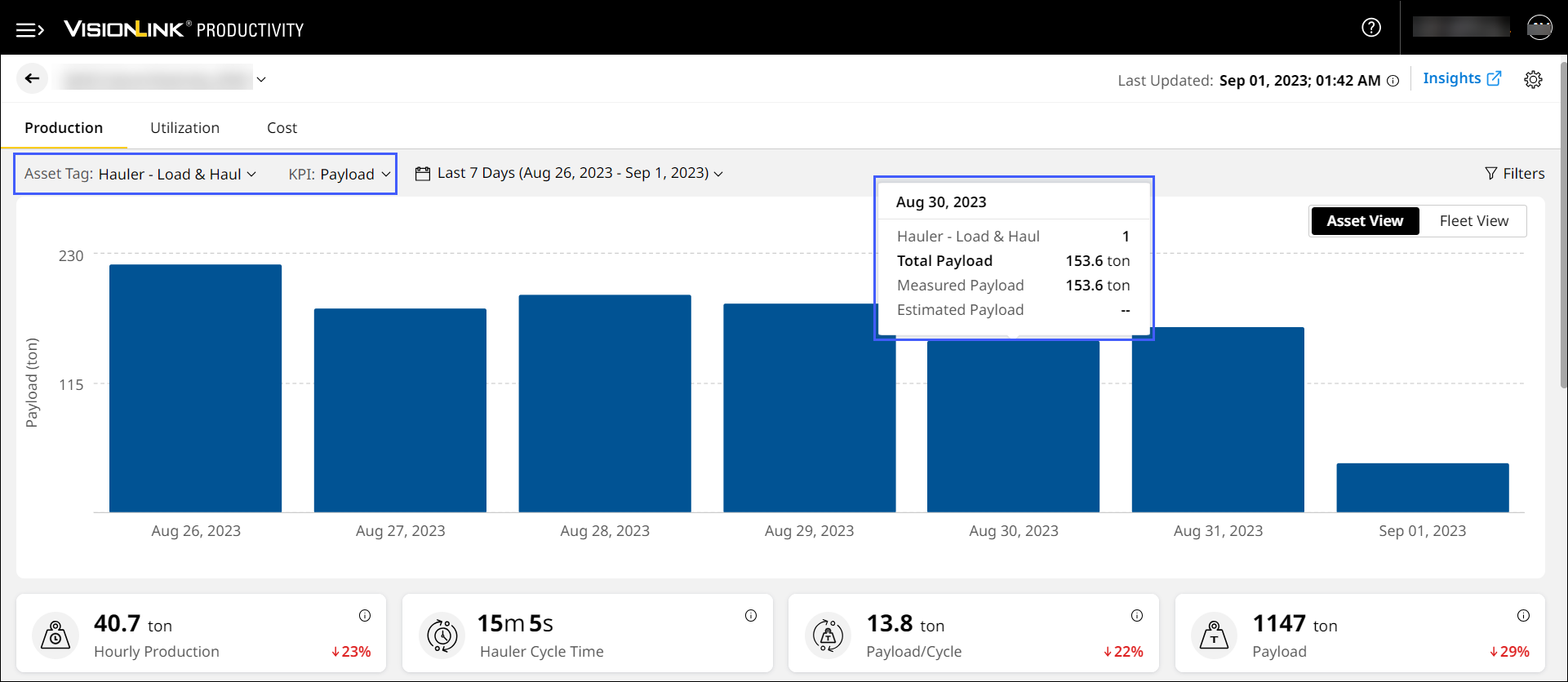 The new and improved bar graph under Asset List makes it easier to quickly view each configured asset’s overview. This feature is available for the selected date range across Production (Site), Utilization (Site) and Cost (Site).