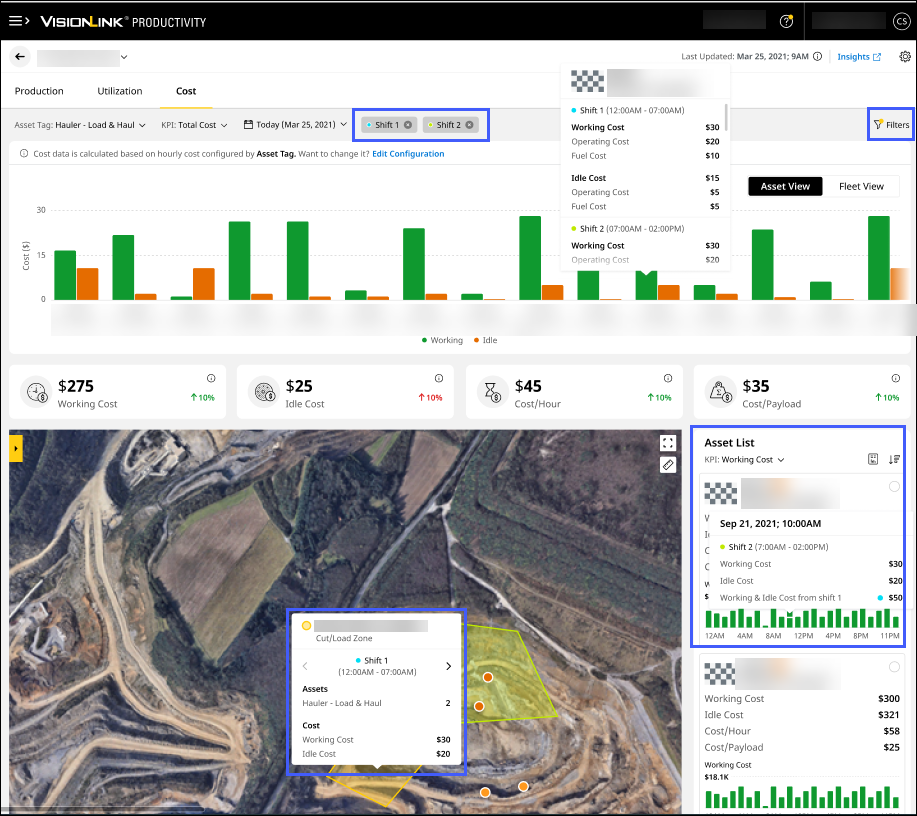Filter shift data to refine Cost KPIs. This allows for a more granular analysis of your site's performance within a specific time-period. You can also click on hotspot in map view and zones to display shift data.