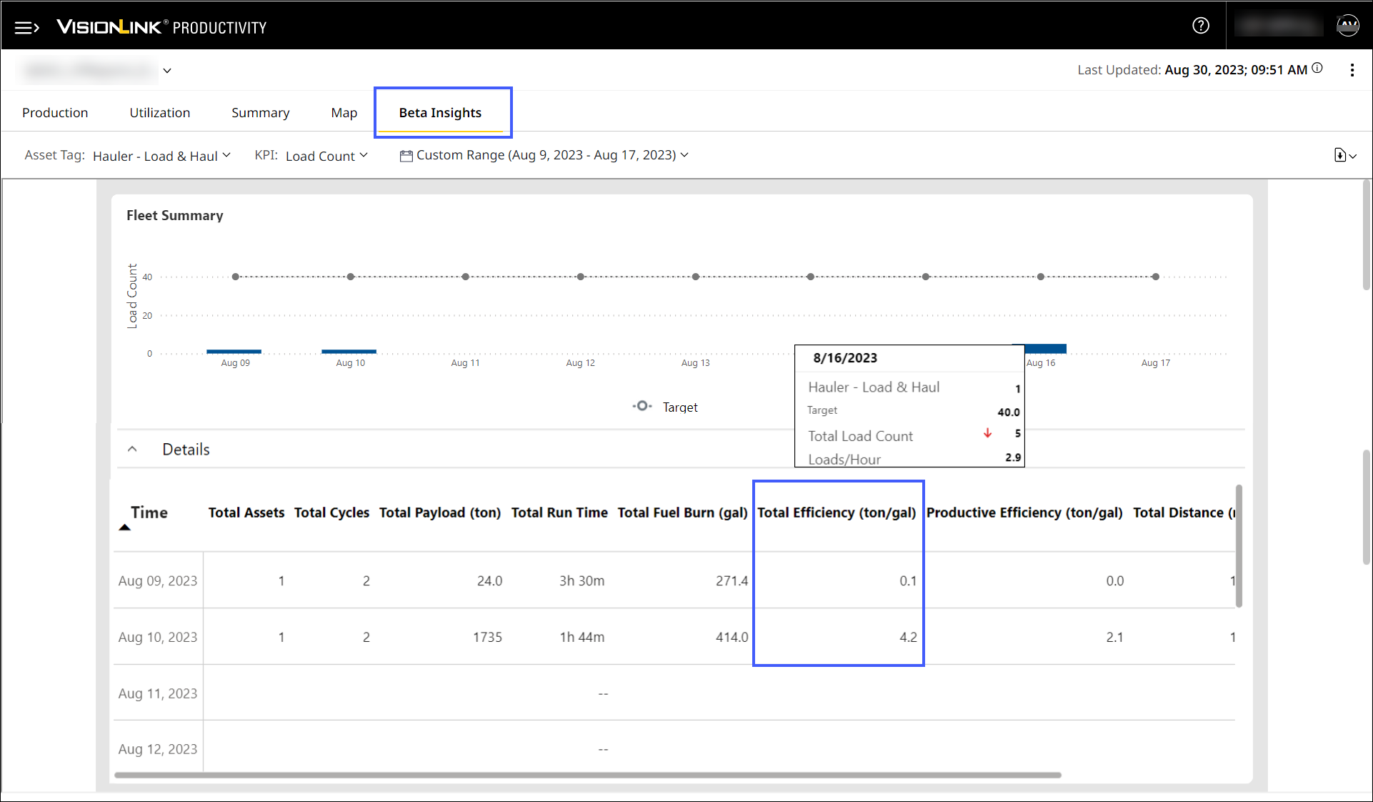 Obtain additional data on your asset’s efficiency under Total Efficiency column on Insights Summary and Beta Insights. Total efficiency indicates the asset’s efficiency when the asset is running.