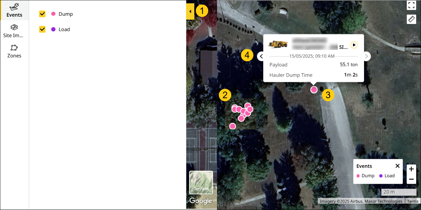 • Events in the slider pane will change based on the KPIs selected above. For instance, on Production (Site) and Cost (Site) tabs, selecting Load Count will display Load events data in the map view. Similarly, selecting Payload will show Dump events data.