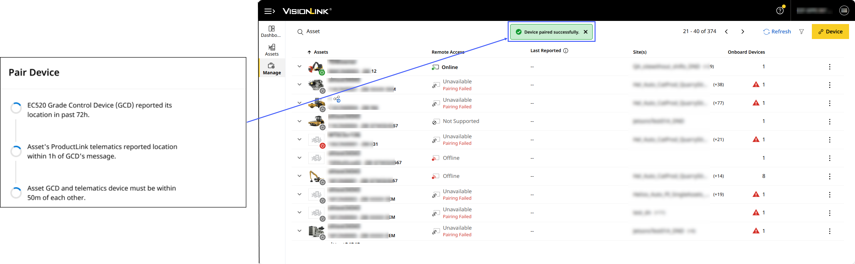 Now, pair assets with EC520 grade control devices (GCDs) to enable all VisionLink Grade features without needing a factory-installed network manager (PLE742/PLE743).