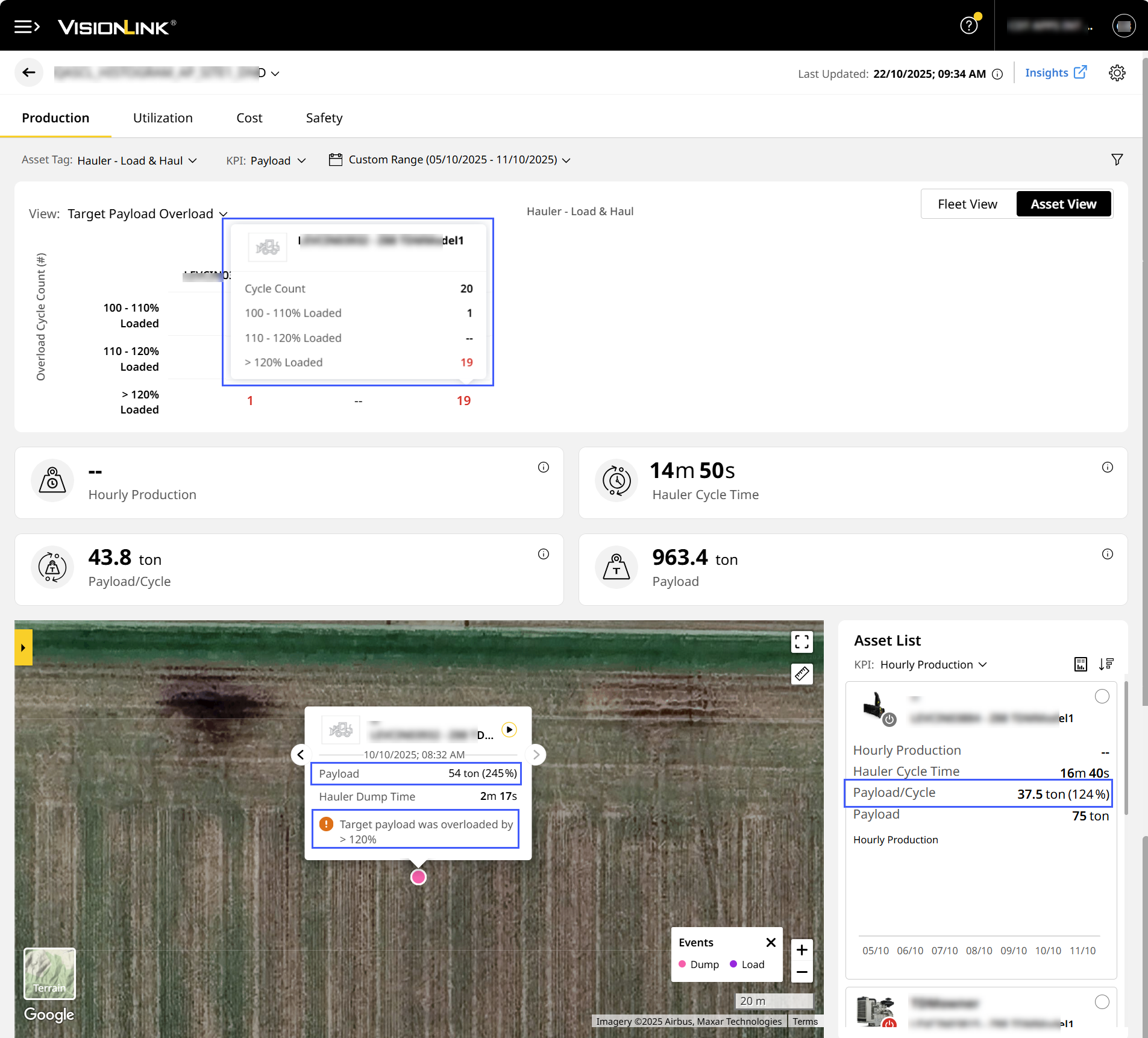 Now, track and filter payload overloading from the new 100-110% range, along with the existing 110–120% and >120% ranges. On Site Summary Asset List and Map View, view the payload percentage alongside payload value, with overloading alerts for quick assessment of loading efficiency.